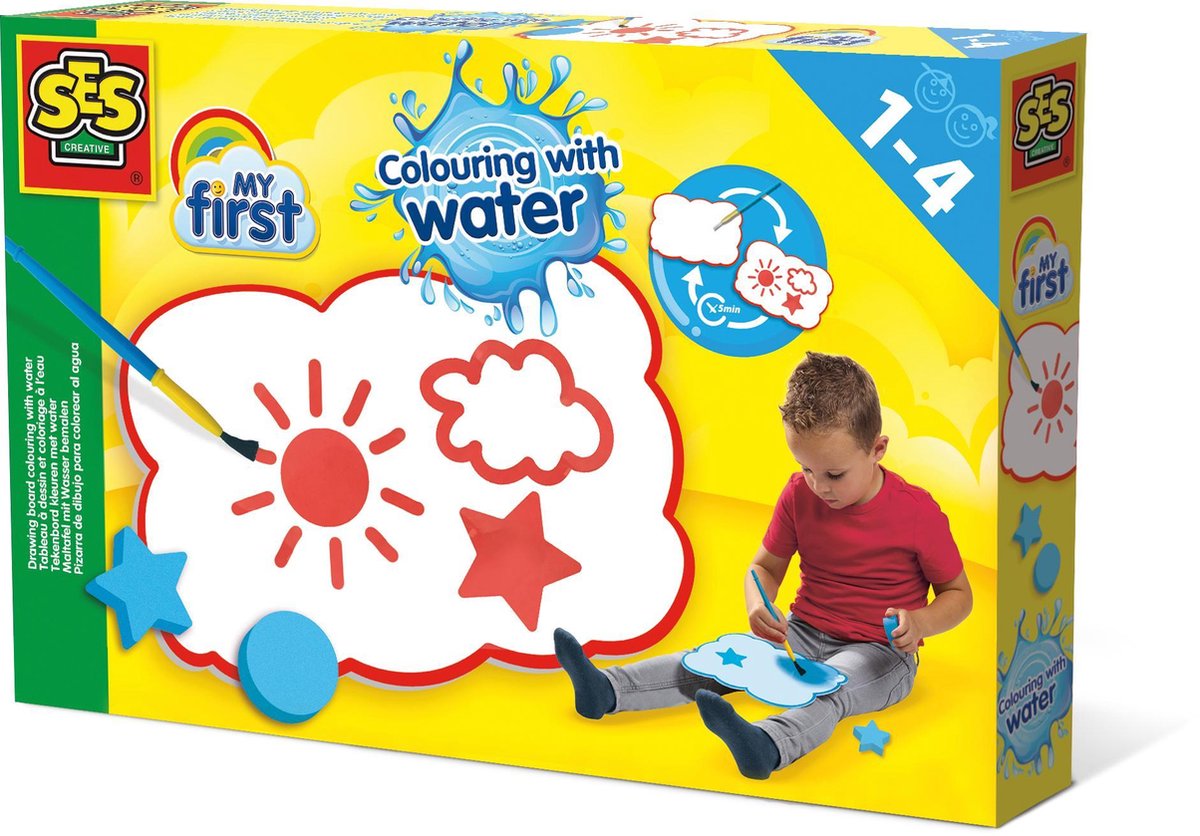 Op dit tweezijdige tekenbord uit de My first lijn van SES Creative kan je kleuren met water. Gebruik de ster en het rondje van foam om figuren te stempelen of klieder lekker met het kwastje en ontdek het magische effect van water op dit tekenbord. Zodra het bord opdroogt, verdwijnen de kleuren weer, zodat je eindeloos kan blijven spelen.