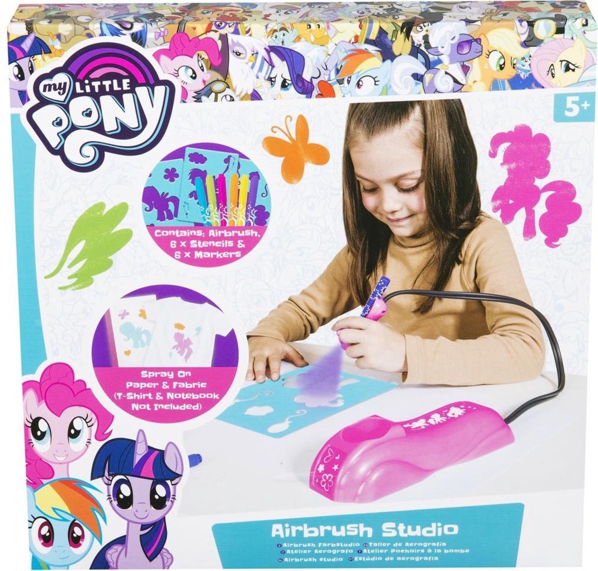 Deze My Little Pony airbrush Studio laat kinderen op creatieve wijze hun favoriete karakters tot leven brengen. Met de airbrush pomp, markers en sjablonen kan je gave effecten creëren!