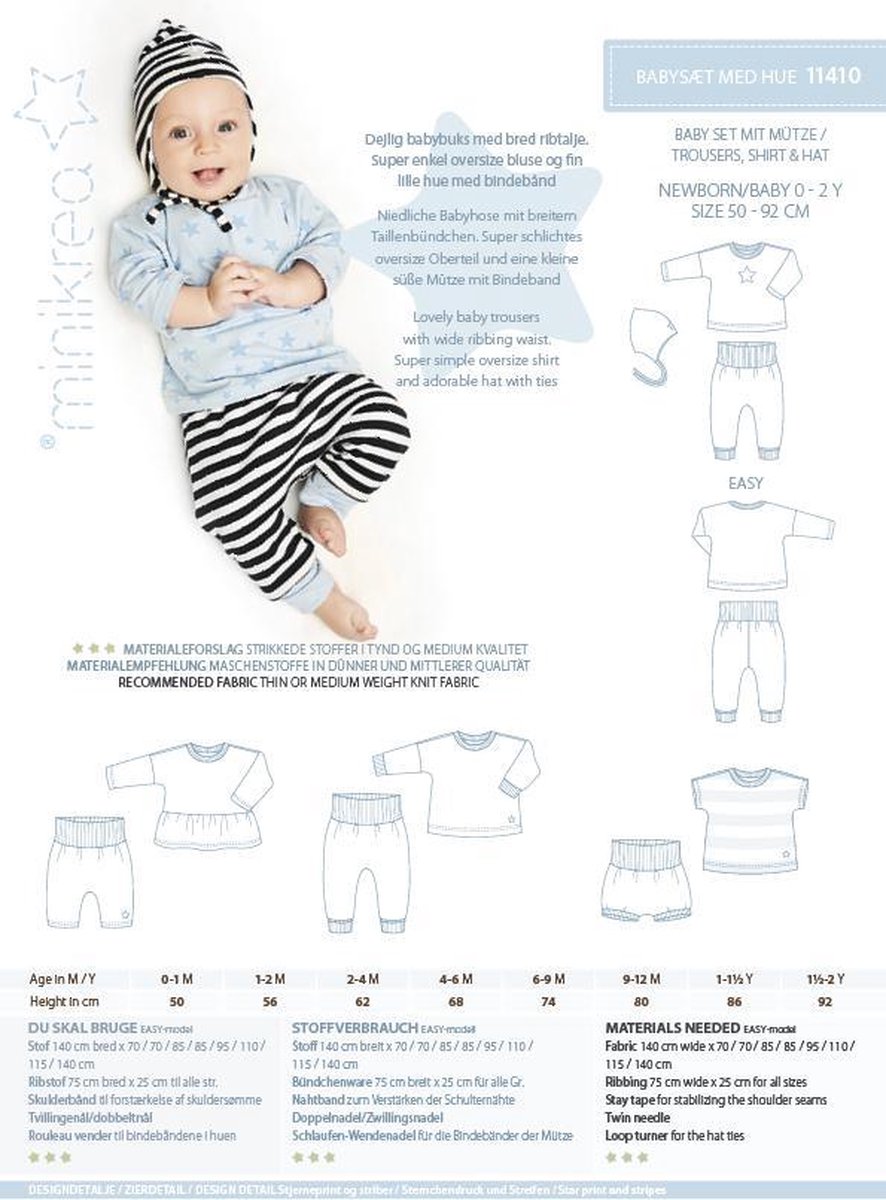 Alle patronen van Minikrea zijn ook voor beginnende naaisters zeer haalbaar. Met dit patroon kan je een heel setje maken voor zowel jongens als meisjes van 0m tot 2 jaar. Een broekje, shirt en muts. Zoals bij alle patronen van Minikrea staan ook hier op het raderblad een aantal variaties op het basispatroon. Nog meer mogelijkheden dus.