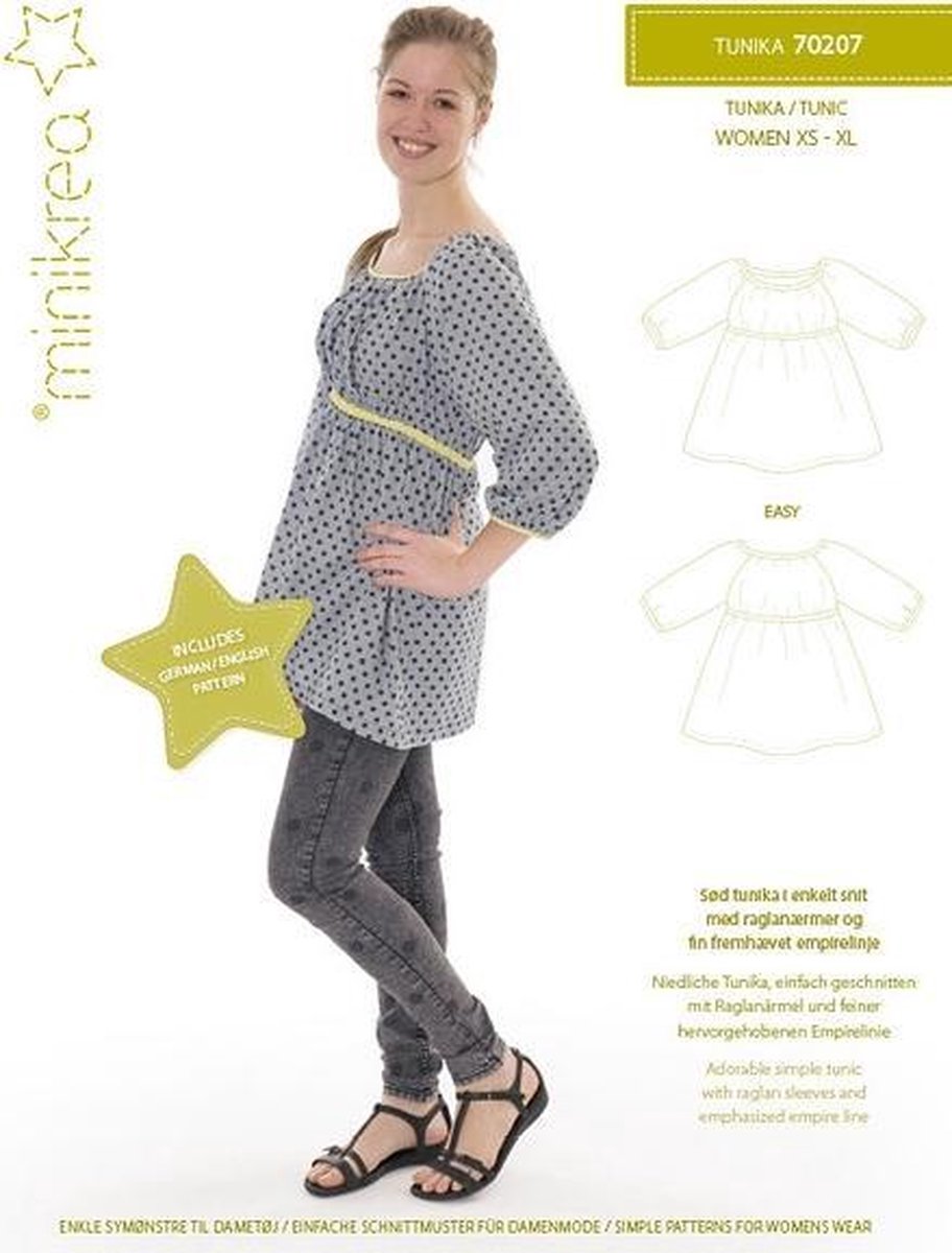 Met dit patroon maak je een tuniek van maat XS(32/34) tot XL (48/50). Alle patronen van Minikrea zijn ook voor beginnende naaisters zeer haalbaar. Zoals steeds staan er op het raderblad ook een aantal variaties op het getoonde model. Instructies: Deens, Duits, Engels & Nederlands