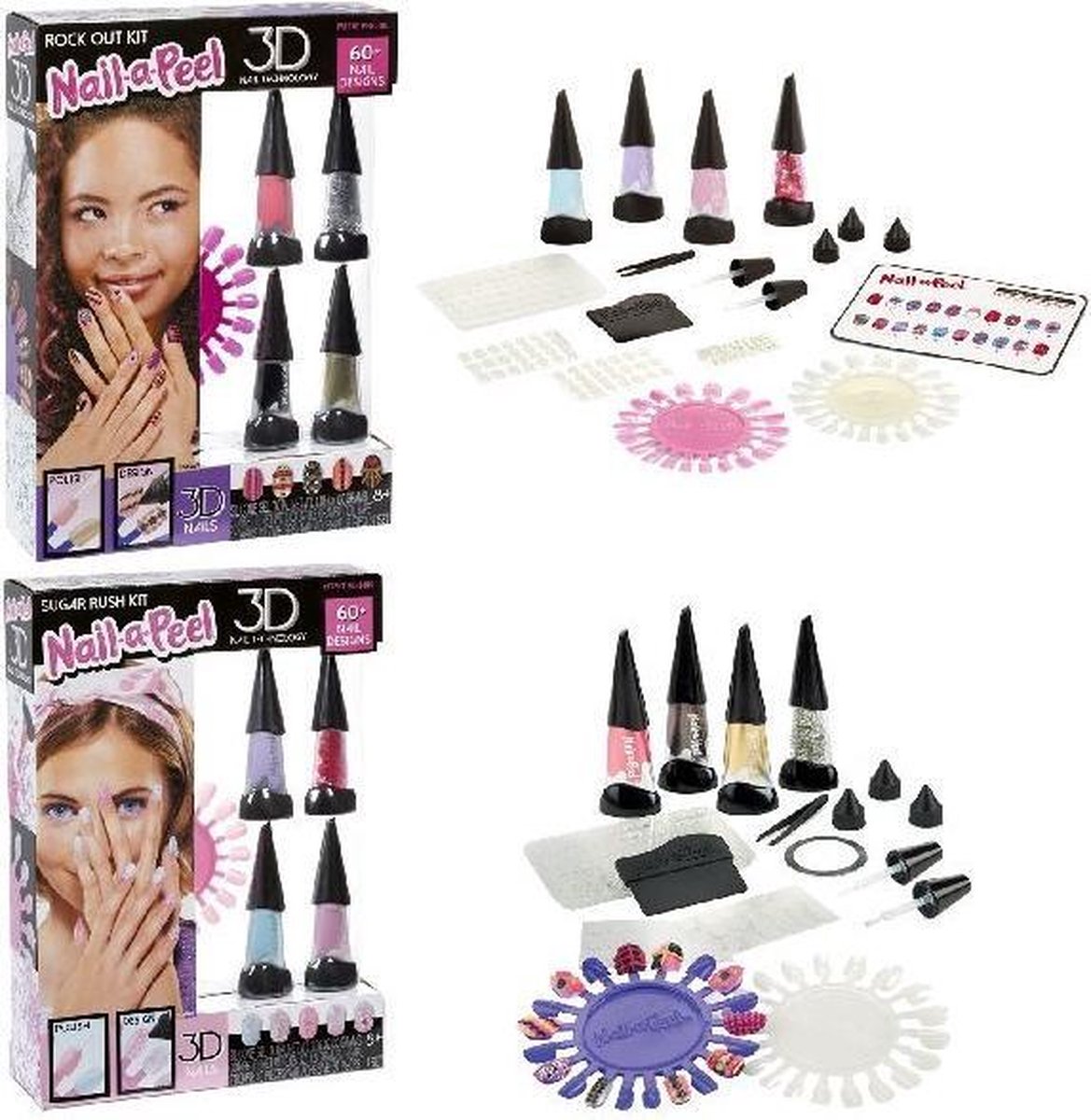 Supermooie Nail-a-Peel Theme Kitmet veel accessoires. Deze set heeft 4 Nail-a-Peel-tubes met gellak, een nagelschijf om op te ontwerpen, nageltray en wisser om nagelbedeltjes te maken, 2 penseelapplicators, ontwerpsjablonen, nagelfolie, manicure- en onwerptools. Verkrijgbaar in 2 uitvoeringen. U kunt niet kiezen, maar ontvangt een willekeurige uitvoering.
