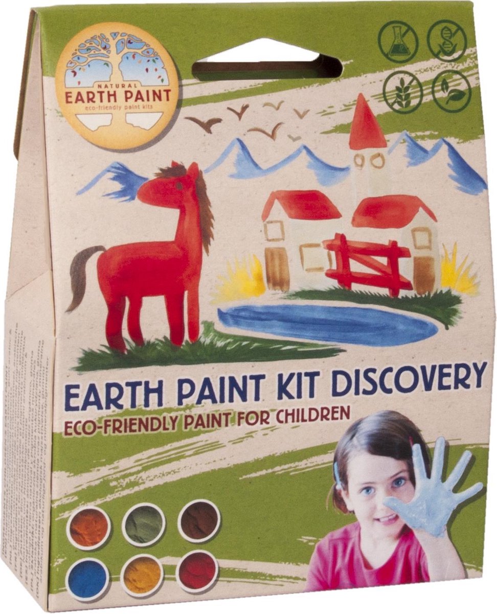 Ontdek de natuurlijke verf van Natural Earth Paint met deze KIT DISCOVERY. Mooie kleuren, fijne waterverf die heel puur is! Dit is een verfkit met 6 kleuren poeders mineraal pigment in de kleuren bruin, rood, oranje, geel, groen en blauw, welke met water aangemaakt ca. 1 liter verf maakt. Inclusief bamboe verfkwast. Je maakt heel eenvoudig zelf de verf door de poeder 1 op te mengen met water. Daarom is deze verf zeer economisch in gebruik. Je maakt wat je nodig hebt en daarna kun je het nog ca 2 weken goed houden in de koelkast of zelfs invriezen. Geheel natuurlijke verf zonder synthetische toevoegingen en naar verhouding tot de prijs een zeer economisch alternatief voor verftubes. Maar vooral gewoon heel mooie verf, verzadigde kleuren, warme kleuren en geheel gifvrij. De kinderverf is geschikt voor het schilderen op hout, papier, steen, glas en kurk, maar ook het verven van wol is mogelijk met een bepaald recept. Je kunt de verf dus gebruiken als vervanging voor raamstiften. Je maakt