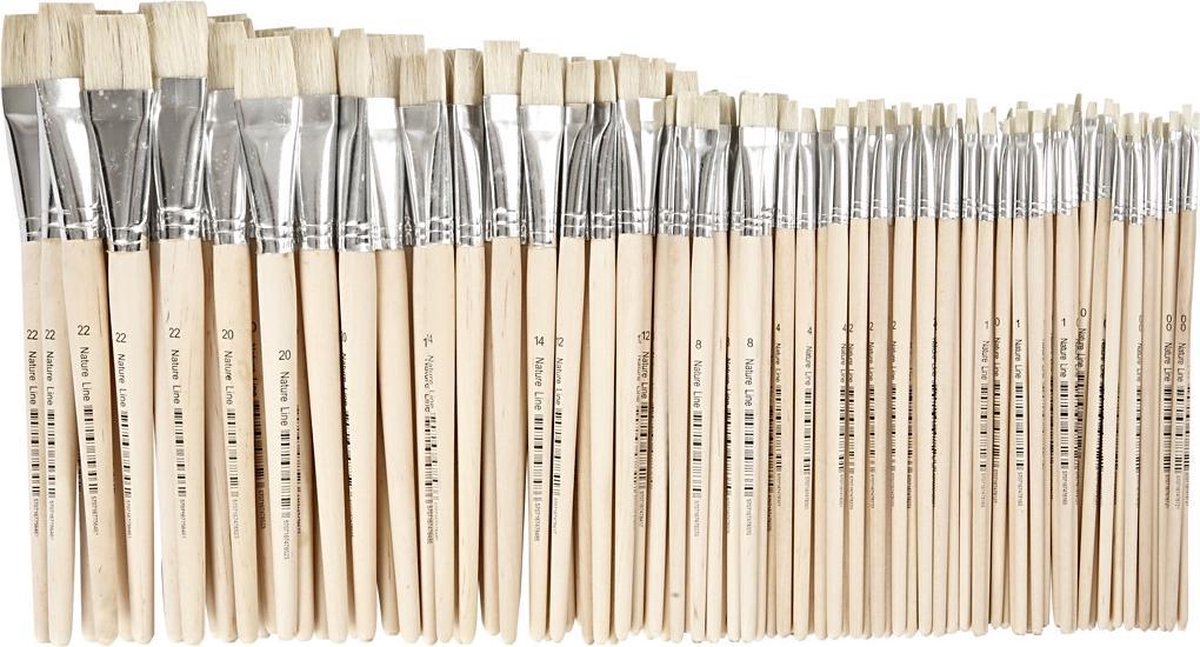 Platte, varkensharen kwast met houten steel - ideaal voor gebruik met dikkere verf.Assortiment platte varkensharen kwasten met korte steel in diverse maten - ideaal voor gebruik met dikkere verf.