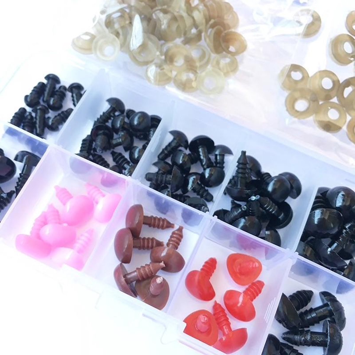 Dit pakket bestaat uit zwarte oogjes en gekleurde neusjes. Het pakketje omvat het volgende: 10x 6MM oogjes (5 paar) 10x 8MM oogjes (5 paar) 10x 9MM oogjes (5 paar) 10x 10MM oogjes (5 paar) 10x 12MM oogjes (5 paar). 5x zwarte driehoek neusjes 10x11MM 5x roze driehoek neusjes 10x11MM 5x bruine driehoek neusjes 10x11MM 5x rood driehoek neusjes 10x11MM 5x zwarte hondenneusjes 9x12MM Dat alles inclusief sluitingen, en opbergdoosje.