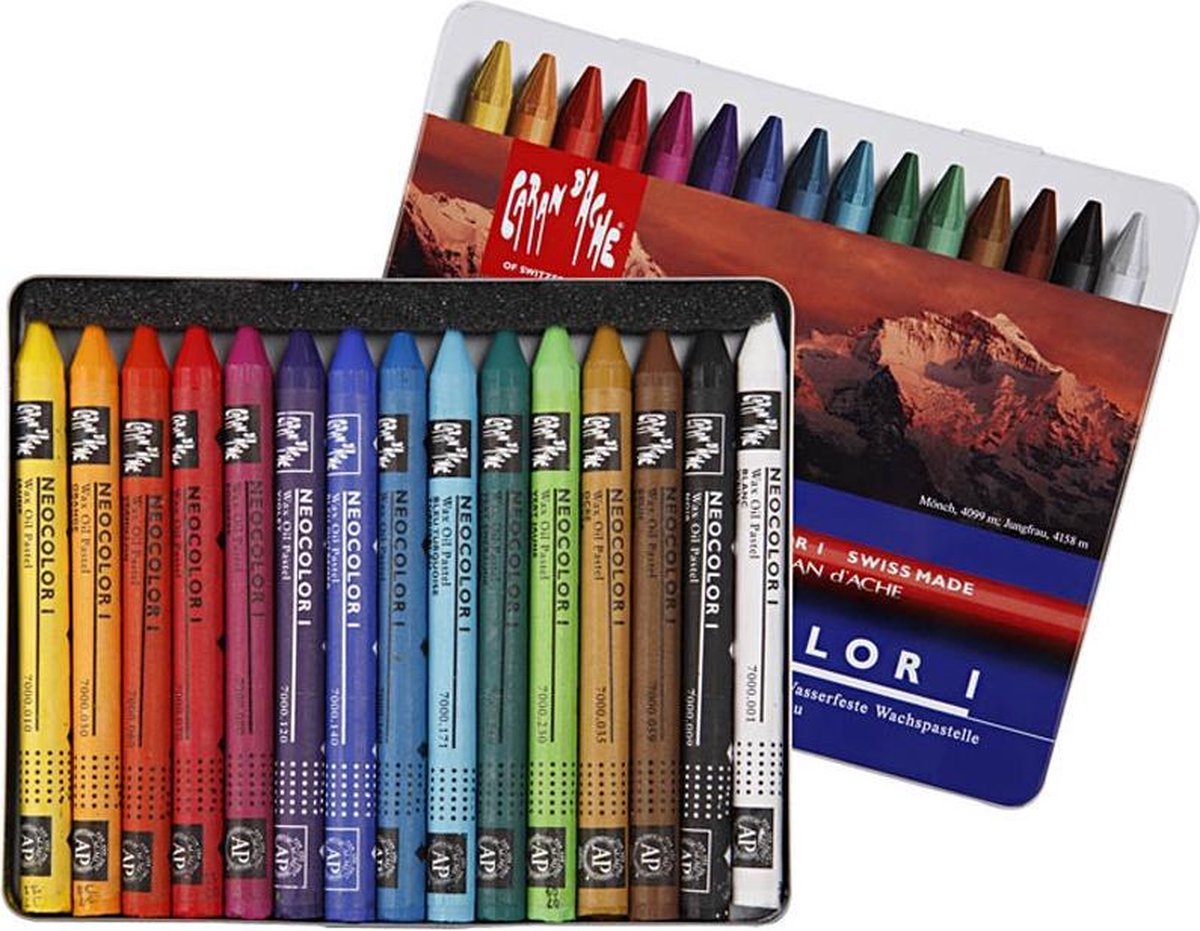 Neocolor I (15 stuks) Waterbestendig krijt op oliebasis van Caran d'Ache in studiekwaliteit met imponerende kleureigenschappen. Geleverd in een metalen doos.