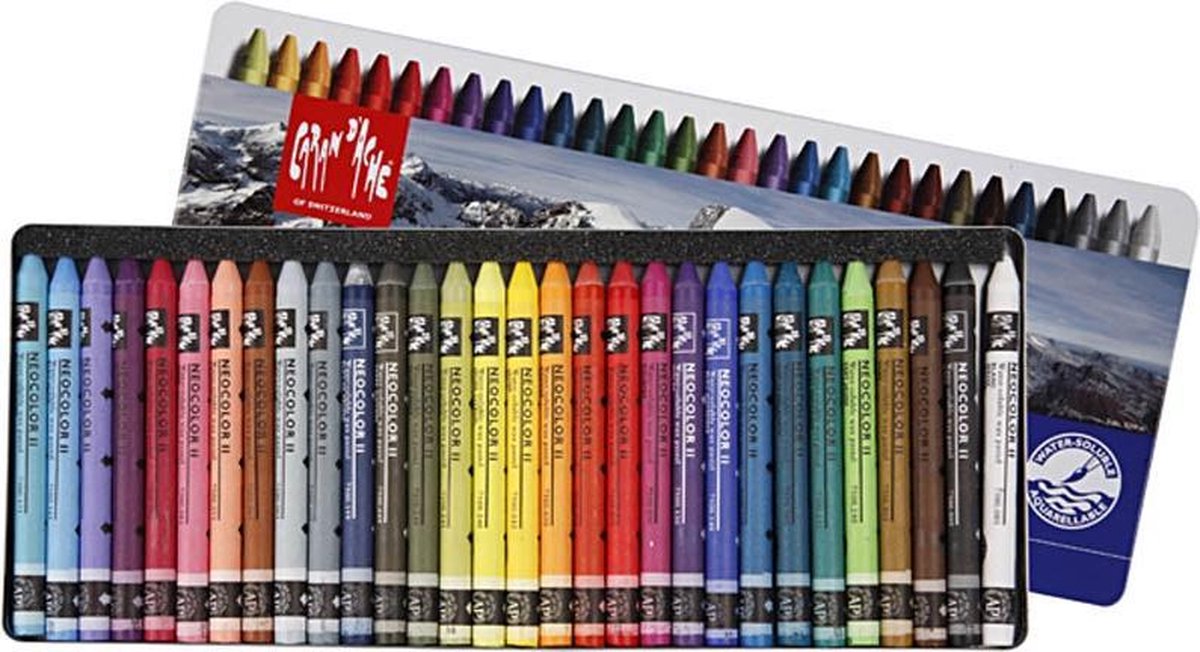Neocolor II (30 stuks) Wateroplosbaar waskrijt met hoge pigmentconcentratie van Caran d'Ache. Kleuren vermengen prachig met water. Geleverd in metalen doos.
