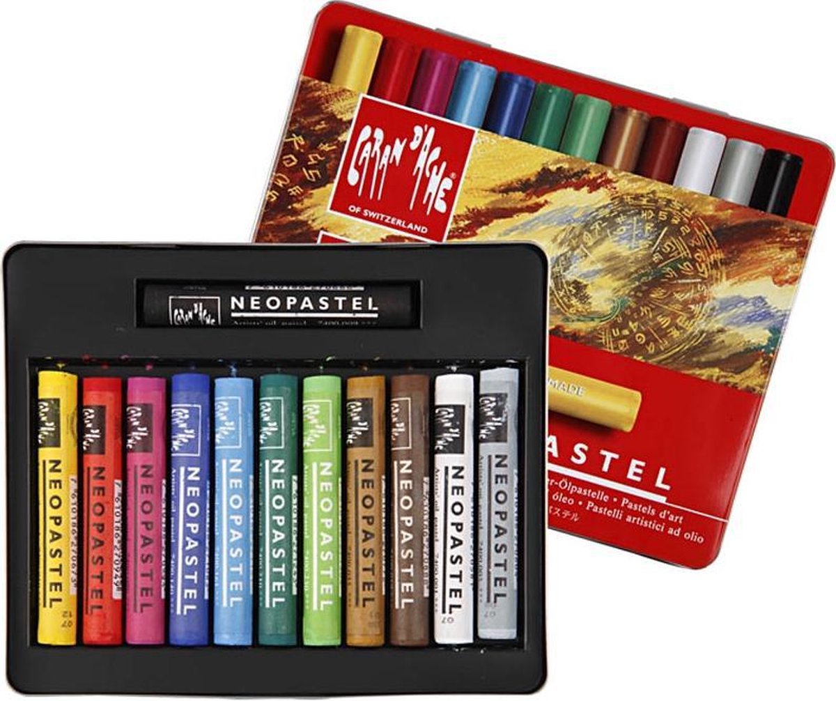 Neopastel (12 stuks) Caran d'Ache waterbestendig krijt op oliebasis met een zachte en niet-poederige structuur, hoge pigmentconcentratie en lichtvastheid. Geleverd in een metalen doos.