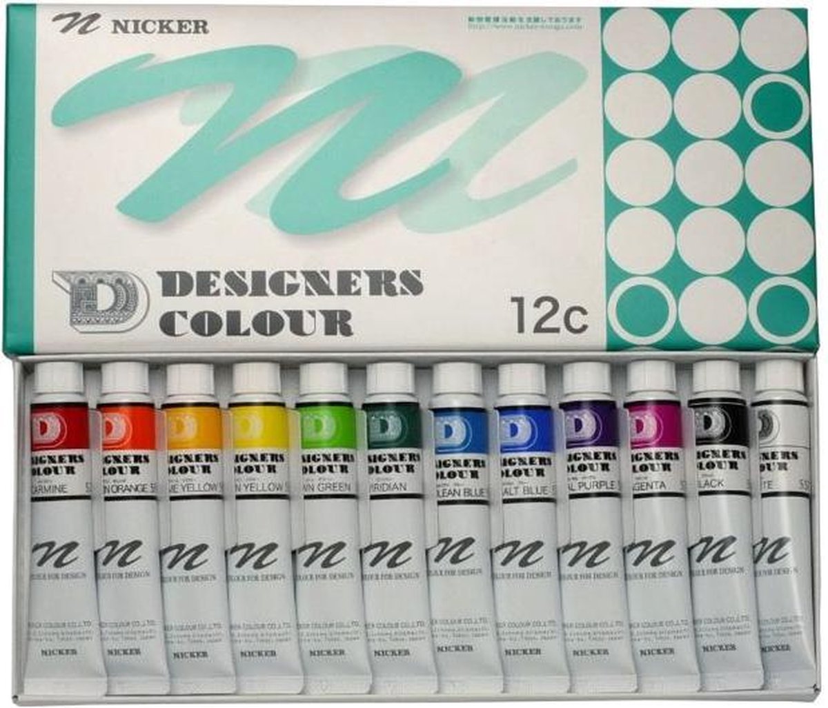 Nicker Designer Colours - 12 stuks Deze ondoorzichtbare waterkleuren verf van Nicker is een echt juweel, gemaakt met de beste kwaliteit pigmenten, terwijl het de goede kwaliteit '' perfecte kleur reproductie en mixbaarheid '' van de poster colours intact houdt. De kleuren kwaliteit en de mixbaarheid zonder troebel te worden zijn bij de designer colours nog beter dan bij de poster colours, je kan ook echt de zachtheid van de verf met iedere strook voelen. ? - Waarom Nicker ? : Nicker maakt al sinds 1947 verf van hoge kwaliteit en wordt gebruikt door bekende animatie studio's zoals Studio Ghibli en Dragonball Z . Gemaakt met de beste Arabische Gum voor een perfecte spreiding en egale dekking Kan zowel droog en nat gebruikt worden en is water afstotend wanneer droog. Kan gebruikt worden om transparante lagen te maken. Duurzaam in gebruik door de snelle en goede dekking. Betrouwbare Kwaliteit uit Japan en top service via onze website. Verkrijgbaar in een 20ml tube Het beste te gebruiken