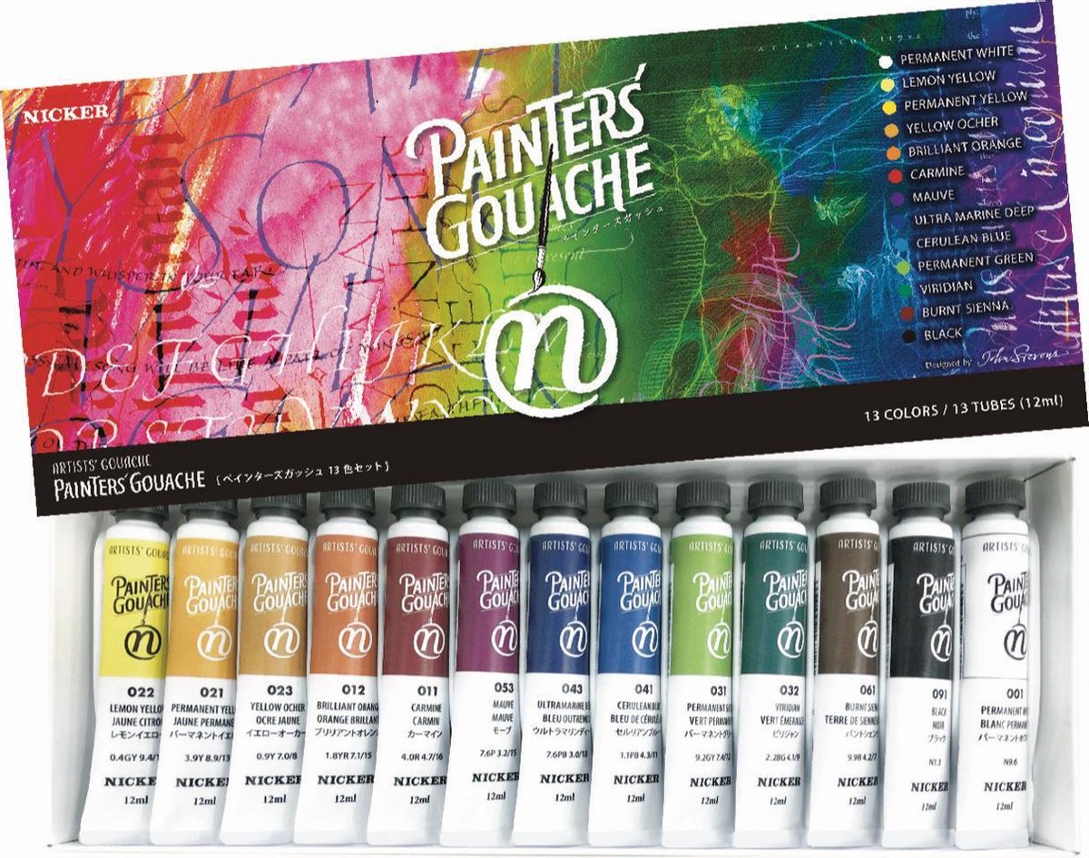 Nicker Painters Gouache 12ml - set 13 stuks Deze ondoorzichtige water kleuren zijn gemaakt met de beste Arabische gum voor de perfecte verspreiding. Aangezien de Painters Gouache egaal verspreid zonder te bloeden is het perfect voor een gladde zachte coating. De verf wordt niet troebel zelfs wanneer je het mixed met andere kleuren, ook blend het perfect met water, hierdoor zijn veel waterkleur technieken mogelijk. Dit is de perfecte gouache waar Nicker naartoe gewerkt heeft. ? - Waarom Nicker ? : Nicker maakt al sinds 1947 verf van hoge kwaliteit en wordt gebruikt door bekende animatie studio's zoals Studio Ghibli en Dragonball Z . Gemaakt met de beste Arabische Gum voor een perfecte spreiding en egale dekking Kan zowel droog en nat gebruikt worden en is water afstotend wanneer droog. Kan gebruikt worden om transparante lagen te maken. Duurzaam in gebruik door de snelle en goede dekking. Betrouwbare Kwaliteit uit Japan en top service via onze website. Verkrijgbaar in een 12ml tube