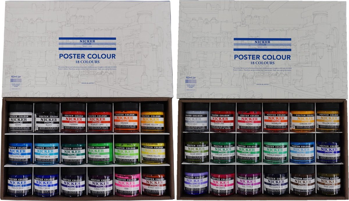 Nicker Poster Colours 40ml - 36 stuks Bij ons koop je dezelfde Nicker poster colours die al sinds het begin van Nicker traditie getrouw gemaakt worden. Nicker poster colours worden gemaakt met de beste pure Arabische gum als binder, vergeleken met dextrine, welke normaal gesproken wordt gebruikt. Het verschil is soepele en egale spreiding en het verdunnen voor transparante technieken zonder nadelen. Het is een veelzijdige verf dat zowel als een ondoorzichtbare verf en transparante waterverf gebruikt kan worden. ? - Waarom Nicker ? : Nicker maakt al sinds 1947 verf van hoge kwaliteit en wordt gebruikt door bekende animatie studio's zoals Studio Ghibli en Dragonball Z . Gemaakt met de beste Arabische Gum voor een perfecte spreiding en egale dekking Kan zowel droog en nat gebruikt worden en is water afstotend wanneer droog. Kan gebruikt worden om transparante lagen te maken. Duurzaam in gebruik door de snelle en goede dekking. Betrouwbare Kwaliteit uit Japan en top service via onze