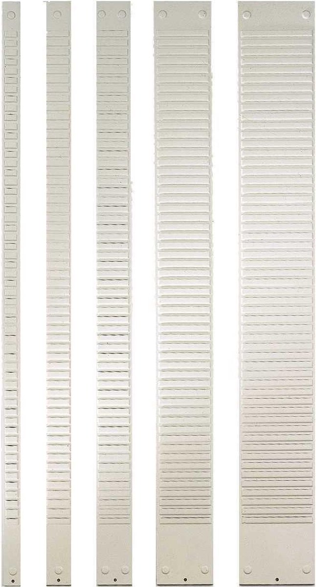 - Verkrijgbaar in 4 verschillende lengtes (24, 32, 40 en 54 sleuven) en 5 verschillende breedtes (Maat 1, 1,5, 2, 3, en 4) - De breedte van de panelen dient gelijk te zijn aan de breedte van de gekozen T-kaarten - Planbord panelen van grijs metaal
