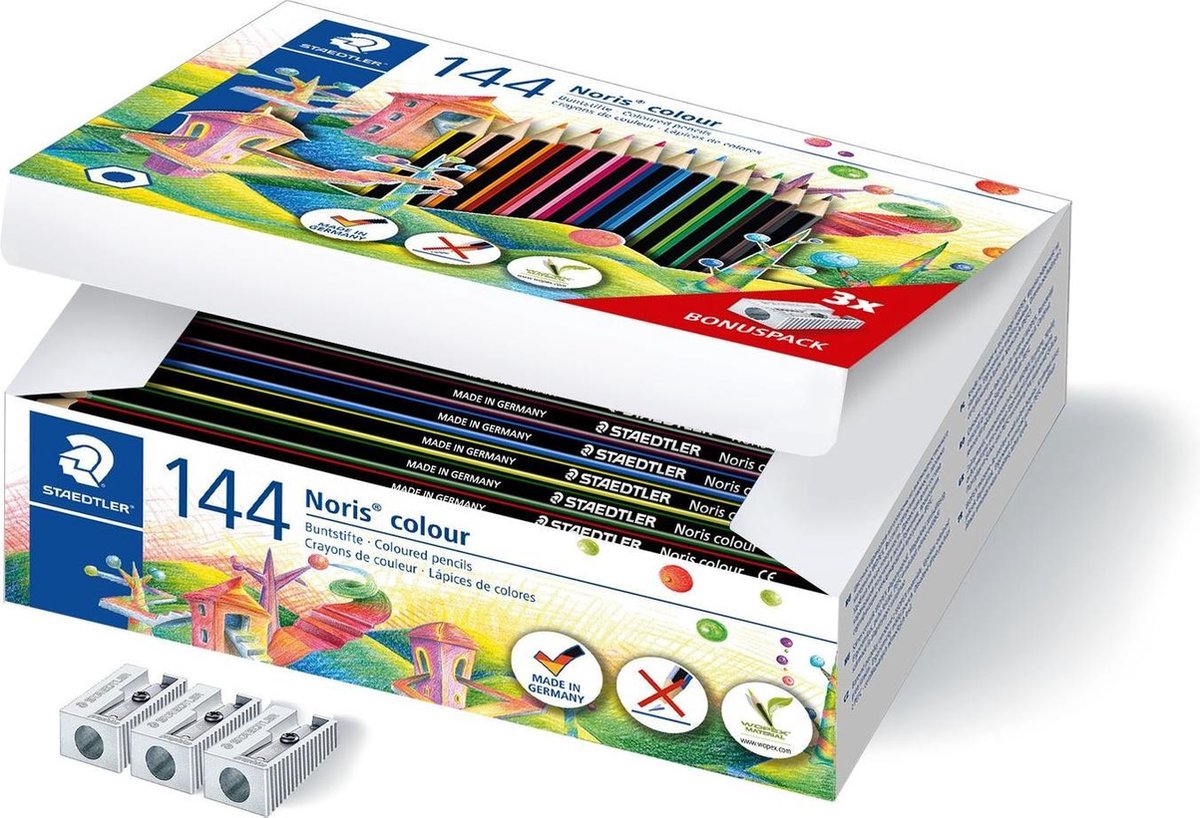 Noris colour 185 kleurpotlood. Het eerste kleurpotlood gemaakt van het vernieuwende WOPEX materiaal. Klassieke, zeskantige vorm. Aantrekkelijk streepdesign. Hoge breukvastheid. Ergonomisch zacht oppervlak. Grotendeels hout van PEFC-gecertificeerde Duitse wouden. Class pack bevat 144 kleurpotloden in 12 geassorteerde kleuren + 3 slijpers 510 10 gratis