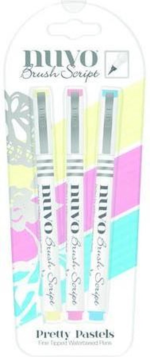 Nuvo Brushpen Pretty Pastels 3 stuks in een verpakking Kleur: Geel (131), Roze (132) en Blauw (133) De brushpen is zeer geschikt voor handlettering. Deze heeft een extra fijne punt waarmee je extra kleine details kunt creëren. De Nuvo brushpen is op waterbasis en heeft een flexibele punt. De brushpennen zijn onderling met water vermengbaar. De punt van de brushpen is kleiner als andere merken.
