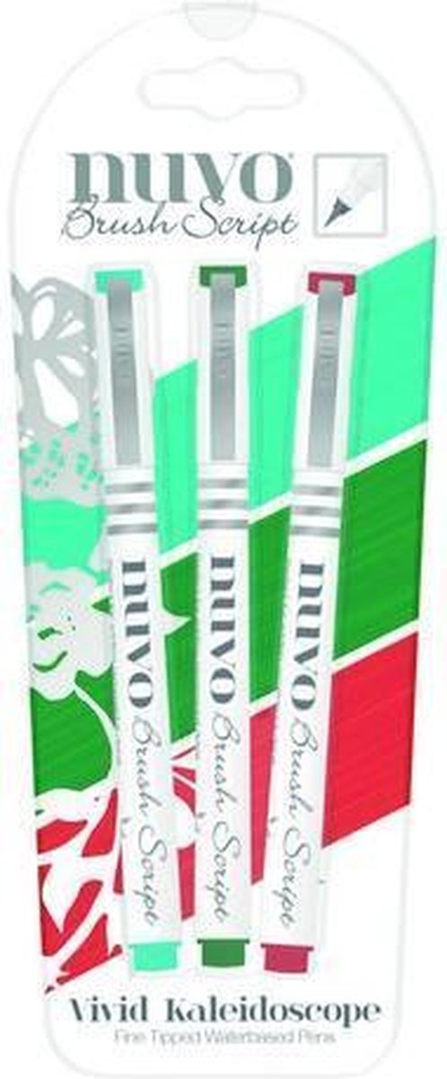 Nuvo Brushpen Vivid Kaleidoscope 3 stuks in een verpakking Kleur: Zeegroen (137), Groen (138) en Rood (139) De brushpen is zeer geschikt voor handlettering. Deze heeft een extra fijne punt waarmee je extra kleine details kunt creëren. De Nuvo brushpen is op waterbasis en heeft een flexibele punt. De brushpennen zijn onderling met water vermengbaar. De punt van de brushpen is kleiner als andere merken.
