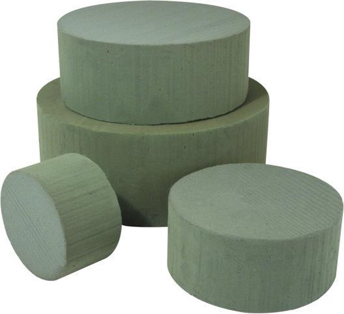 Rond groen steekschuim/oase blok nat 10 x 6 cm. Een voorverpakt rond blok steekschuim voor het insteken van bloemen. Diameter: ongeveer 10 cm, hoogte: ongeveer 6 cm. Steekschuim blokken rond voor echte bloemen.