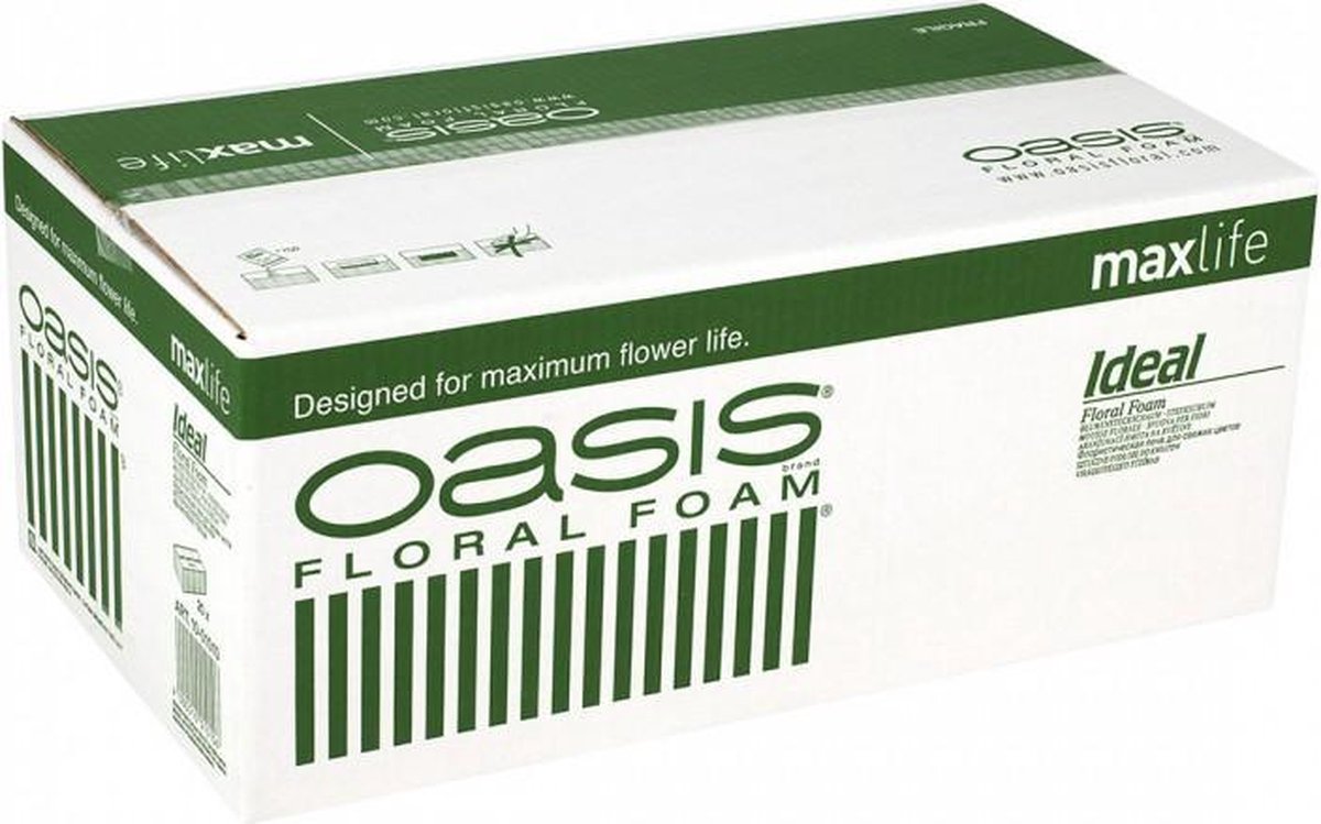 OASIS® IDEAL Steekschuim blokken voor snijbloemen zijn geschikt voor alle bloemstukken. Deze hebben een hardheid tussen OASIS® PREMIUM en OASIS® STANDARD Steekschuim. OASIS® IDEAL zorgt ervoor dat uw bloemen langer goed blijven dankzij de speciale Floralife® bloemenvoeding die verwerkt zit in het steekschuim. Uw bloemen zullen langer goedblijven, de kwaliteit is aanzienlijk hoger dan goedkoop steekschuim waar geen bloemenvoeding in zit verwerkt! Eigenschappen en voordelen: - Allround steekschuim voor (bijna) alle steekwerk - Handige snijlijnen - Uitstekende waterbron - Snelle wateropname - Minimaal waterverlies - Floralife® bloemenvoedig verwerkt in het steekschuim Toepassingen: - Bruikbaar voor alle mogelijke bloemenarrangementen Aantal stuks in het pakket: 20 Specificaties: - afmetingen van één blok steekschuim: 23 cm x 11 cm x 8 cm (L x B x H) - 1 doos is 20 blokken steekschuim