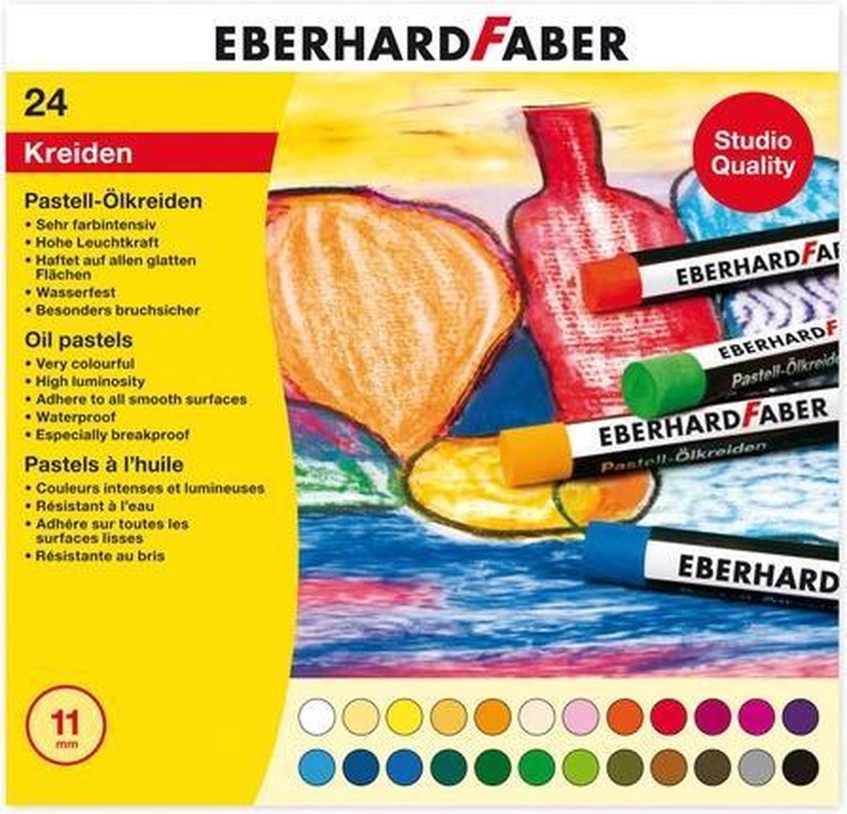 Oliepastelkrijt, studio kwaliteit. Zeer intensieve kleuren op alle gladde oppervlakken, watervast, breukvast en het krijt is met papier omwikkelt. Stift van Ø 11 mm, en 70 mm lang. Verpakt in kartonnen etui. 24 stuks.