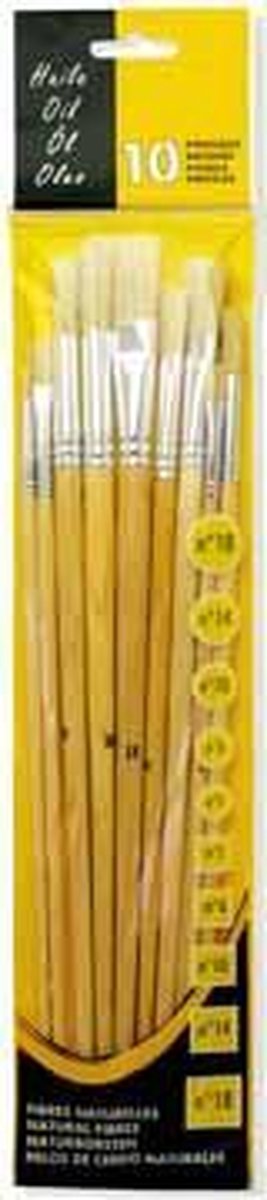 Natuurlijke vezels. Set van 5 ronde penselen (nr 2, 6, 10, 14, 18) en 5 platte penselen (nr 2, 6, 10, 14, 18). Lange steel.
