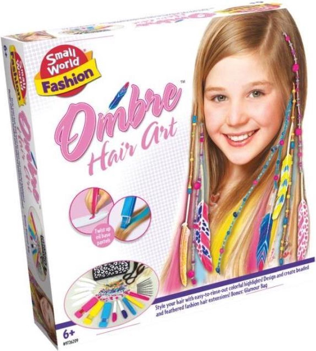 Kleur je haar en versier het met leuke zelfgemaakte accessoires. 6+. Wil je deel uitmaken van de coolste en meest fashionable trend? Wil je roze of blauwe strepen in je haar vandaag? Of misschien kleurrijke gestreepte highlights met speciale haardecoratie? Ombre ? een trendy kit voor creatieve haarontwerpen! Een coole kit voor natuurlijke haarstijlen met een kleurrijke twist! Doe highlights, kleur en kralen in je haar! Inhoud:* 3 pastel haarkleuren gemaakt van olie in speciale plastic houders (elk 3,76 gr)* 3 artificiële haarextensions: blond, bruin en zwart (elk ongeveer 30cm lang)* speciale kralen (ongeveer 1500) in verschillende kleuren en vormen* 6 veren* 3 stiften om de veren te kleuren* 9 haarspeldjes * nylon touw (ongeveer 4m)* 1 naald* Make-up tas om zelf in te kleuren (16x11cm)* 2 speciale textielstiften