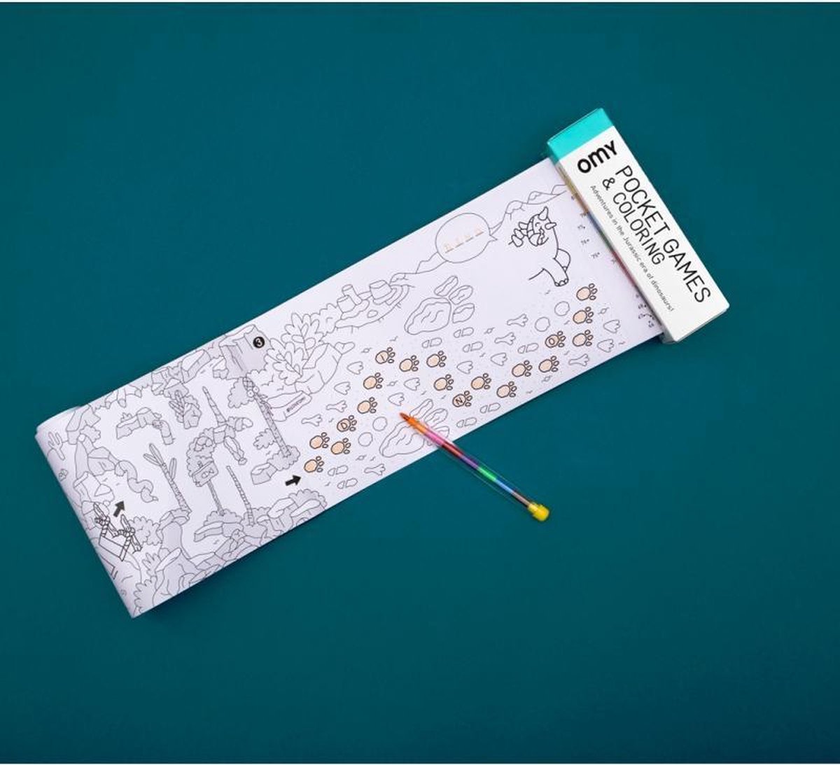DINOS - POCKET GAMES & COLORING Pocket games & coloring One meter treasure hunt and riddles to unroll : adventures in the Jurassic era of dinosaurs! Labyrinths, puzzles and riddles that you can take with you anywhere, from the restaurant to the train! The rules are translated into 6 languages, and coloring pages can be torn along the dotted lines to make sharing and storing easier!
