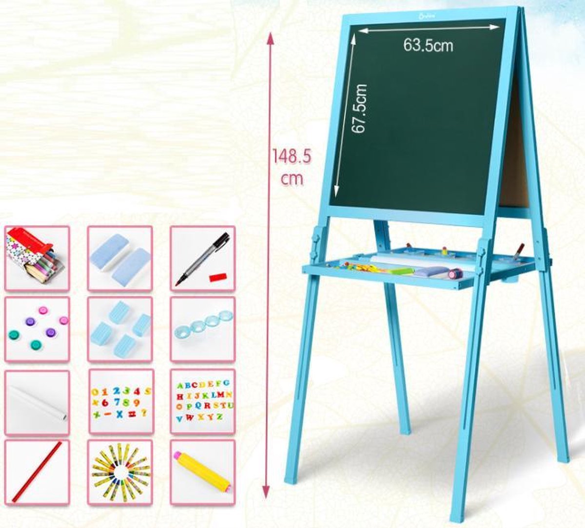 Alles-in-één-tekentafel met gratis accessoires, verstelbare hoogte. Extra groot met een bord van 63.5x67.5 cm! Verstelbare hoogte tussen 86 cm en 106 cm! Het product is voornamelijk van massief hout met een nettogewicht van 8KG! De ene kant is een magnetisch krijtbord en aan de andere kant magnetisch whiteboard. Met de clips kun je een stuk papier vastmaken om je ware schilderkunsten te laten zien. Op het plateau onderin zitten 4 bekertjes en een doos zodat er plaats is voor je krijtjes, penselen, potloden en meer! Onderaan tussen de 2 bakken hangt een rol papier die je langs het bord vast kunt maken aan de clips bovenaan de ezel. En ben je niet tevreden? Scheur het papier af en begin gewoon opnieuw! Veilig, hoge kwaliteit, heeft EU-kwaliteitscertificering!