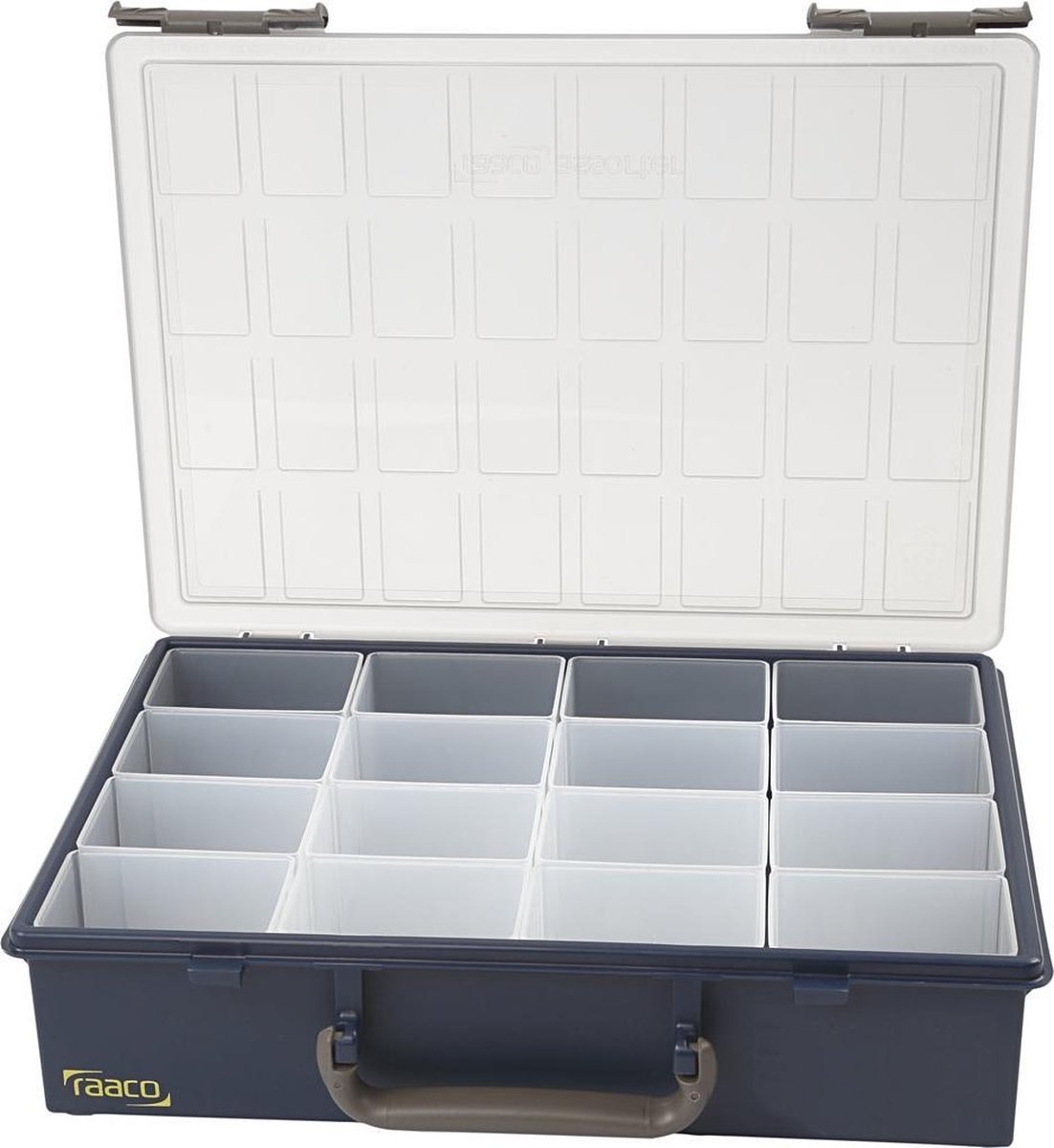 Raaco opslag box gemaakt van polypropyleen (PP) uitgerust met schuifslot en handvat. Kan ingedeeld worden met inzet boxen.Raaco opslag box gemaakt van polypropyleen (PP) uitgerust met schuifslot en handvat.