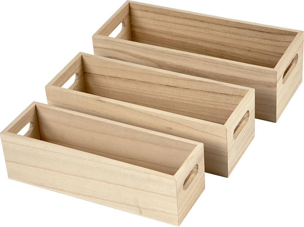 Elegante houten opslag kratten met handvaten - set van 3 maten L:22+23.5+25 cm B: 6.5+7.5+8.5 cm, 3 stuks.Elegante houten opslag kratten met handvaten - set van 3 maten L:22+23.5+25 cm B: 6.5+7.5+8.5 cm, 3 stuks.