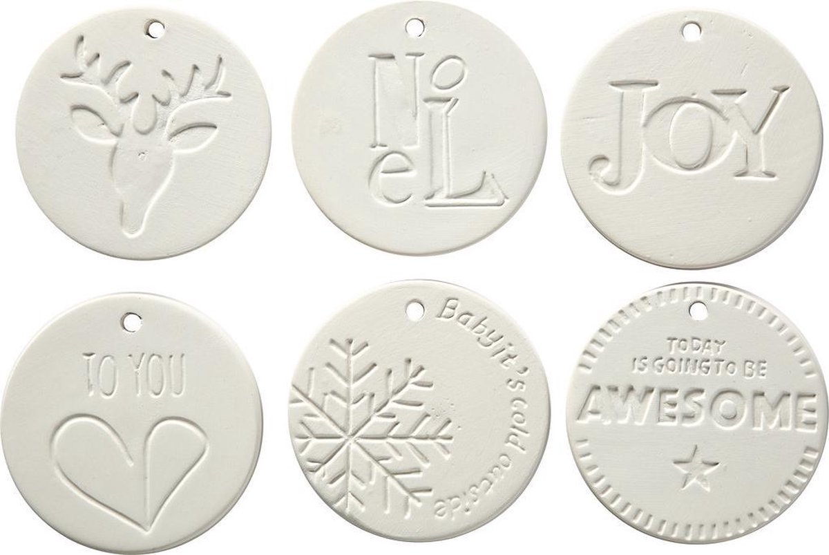 Ornamenten van wit terracotta met een oog om op te hangen.Ornamenten van wit terracotta met een oog om op te hangen.