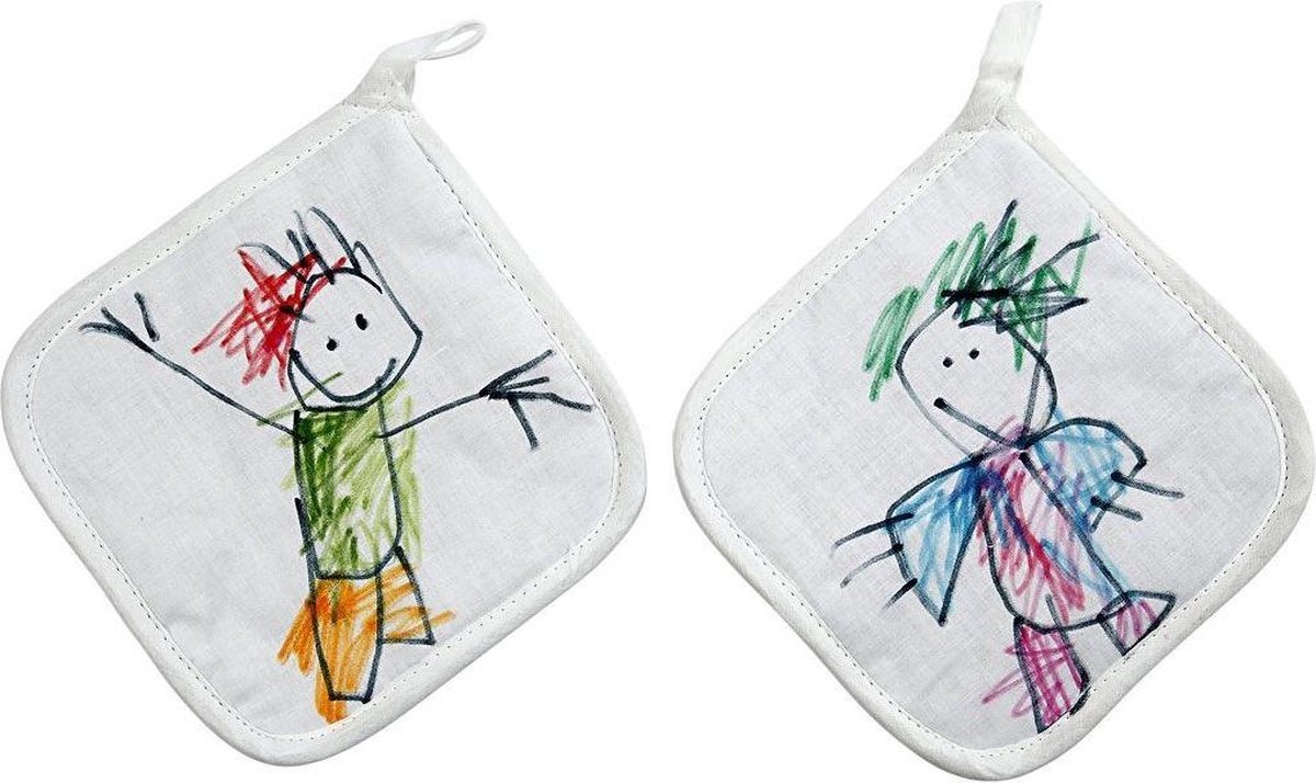 Deze set bevat alle benodigde materialen om 80 pannenlappen gedecoreerd met textielstiften te maken Inclusief instructie. Inhoud: 80 pannenlappen, 60 dubbele punt textielstiften en 12 stuks zwarte, dubbele punt textielstiften