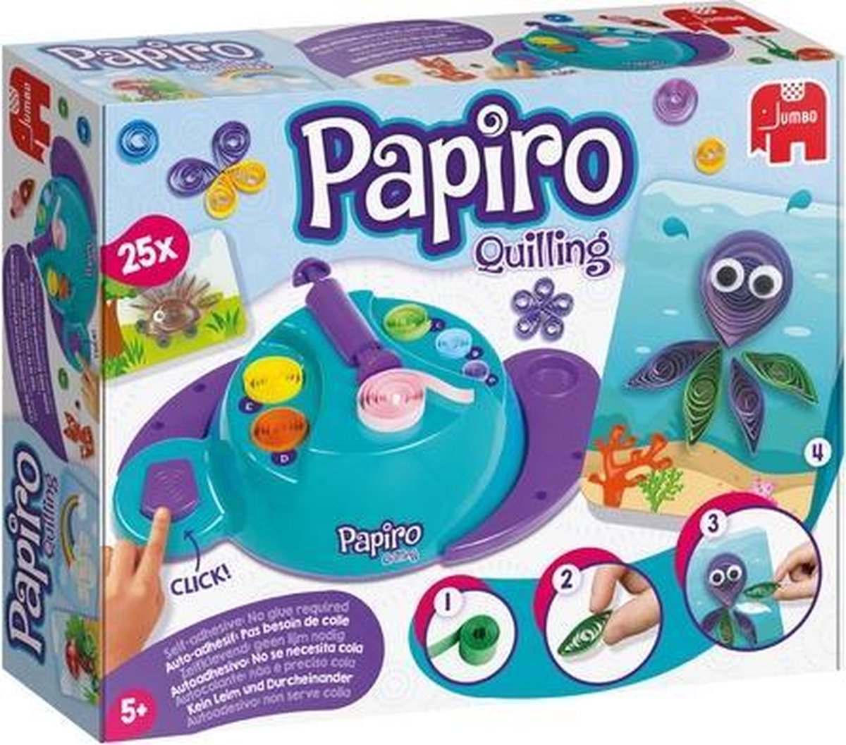 Met Papiro Quilling Station van Jumbo kun je de mooiste kunstwerken maken! Met deze quilling set leer je om kunst van papierstroken te maken. Kies een van de leuke ontwerpen: van schattig eendje tot gave raket. Stap voor stap: 1. Met één druk op de knop tover je een papierstrook om tot een rolletje. Maak ze op de juiste maat en plak ze vast. Geen lijm nodig. 2. Knijp en draai de papierrolletjes in elke gewenste vorm. 3. Plak alle rolletjes op de zelfklevende kaart en maak het kunstwerk af met een paar grappige oogjes! Inhoud: • 1 Quilling station • 200 Zelfklevende papierstroken (140 kort + 60 lang) • 25 Kaarten (22 klein + 3 groot) • Sticker oogjes • Handleiding Geschikt voor kinderen vanaf 5 jaar.