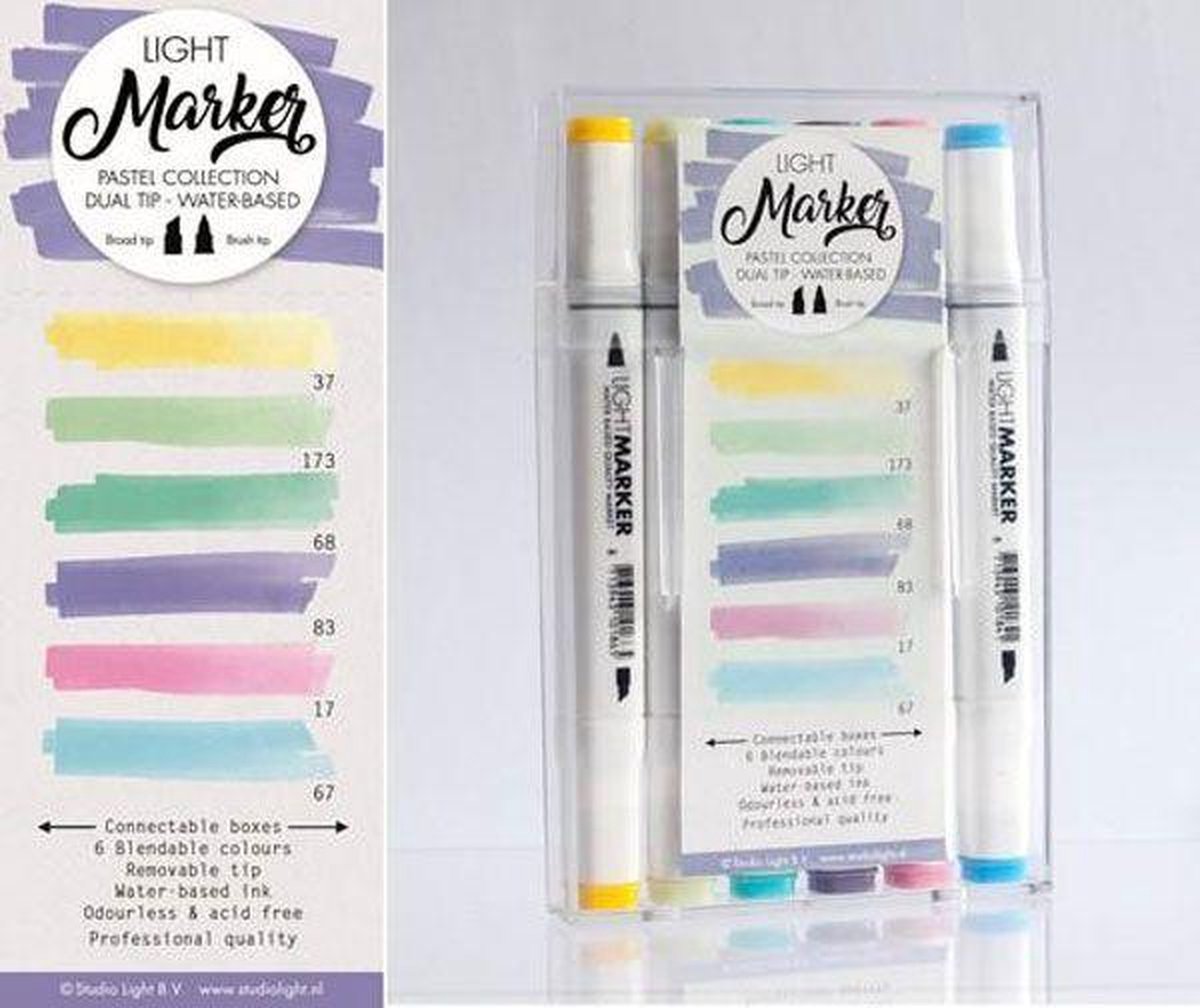 6 Pastel mengbare kleuren in op elkaar aansluitbare dozen Verwijderbare tip Op water gebaseerde inkt Geurloos en zuurvrij Professionele kwaliteit
