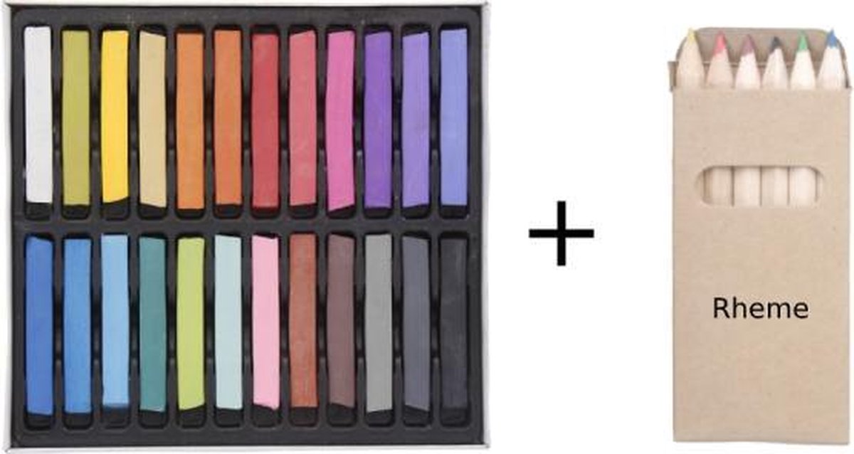 Pastelkrijt 24 Stuks + Rheme Kleurpotloden - Een uitgebreide set van 24 kleurrijke pastelkrijtjes. Of het nu gaat om landschappen, dieren of plantenfoto's, deze set is ideaal voor creatief schilderen in pastel. - Hoge kwaliteit en heldere kleuren zorgen voor uitstekende resultaten bij het schilderen met pastelkrijt. Word artistiek actief met zachte pastelkleuren! - Een zeer hoge pigmentatie zorgt voor een uitstekende pastelkleurkwaliteit en een optimaal resultaat bij het schilderen op papier en diverse andere ondergronden. - De kleuren van de set zijn onschadelijk voor de gezondheid en kunnen op veel verschillende manieren worden gebruikt. Ze kunnen op verschillende ondergronden worden aangebracht en met een vinger met elkaar worden gemengd. - De kleuren zijn ideaal om op grote en kleine oppervlakken te schilderen. Probeer het uit en word creatief bij het schilderen en tekenen in pastel!