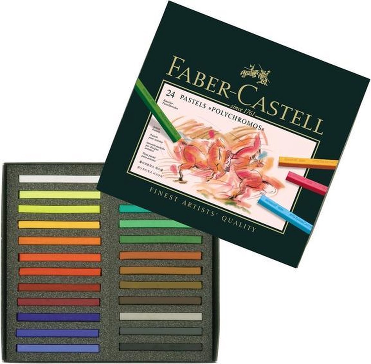 Polychromos pastelkrijt bevatten een hoog pigmentgehalte en zijn vrij van olie en was. De kleurpotloden kunnen uitgesmeerd worden om fijne overgangen in kleur te maken. Harder dan de zachte pastel krijtjes, daardoor zijn de Polychromos kleurpotloden ook zeer geschikt om te tekenen. Pastelkrijtjes van Polychromos worden gekenmerkt door hun stabiele consistentie, economisch gebruik en een uitstekende hechting op papier, karton, hout en steen. Slechts minimale bevestiging is vereist, die ervoor zorgen dat de pastel tekeningen hun levendigheid van kleur behouden. Hoge kwaliteit pigmenten van onovertroffen lichtechtheid. Etui à 24 stuks.