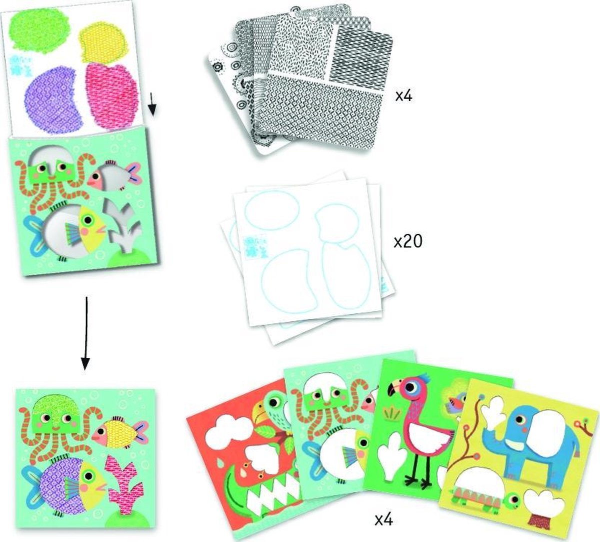 Krasmotieven. De vriendjes van Magail. Het kind kiest de motieven en kleuren en kleurt vervolgens de zones in de doorvoor zijn bedoeld. Daarna schuift hij het vel in de geïllustreerde enveloppe voor een unieke persoonlijke versie van de taferelen. Leeftijd: 3-6 jaar