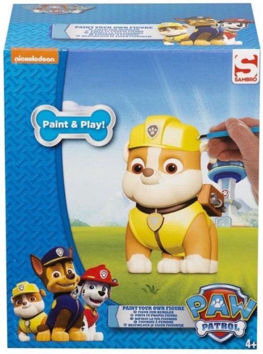 Beschilder je eigen Paw Patrol held! Figuur : Rubble. Inhoud: Gipsen Paw Patrol pup 5 kleuren verf Verfkwast
