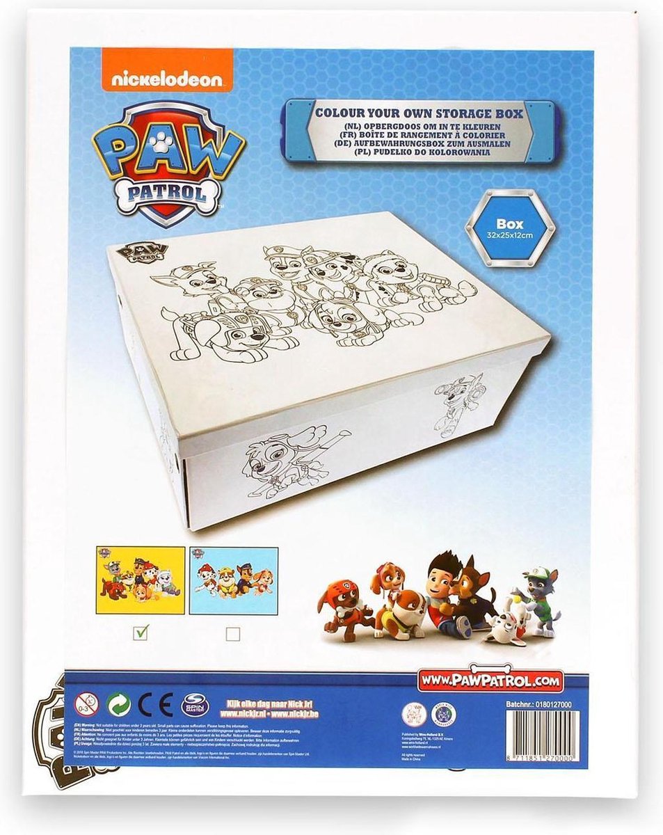 Paw Patrol kleur je eigen opbergdoos. Een opbergdoos van Paw Patrol. De doos is helemaal wit, je moet hem zelf nog inkleuren! Kleur het voorbeeld na of laat je eigen creativiteit los. Geschikt voor kinderen vanaf drie jaar. De doos is 32 x 25 x 12 cm.