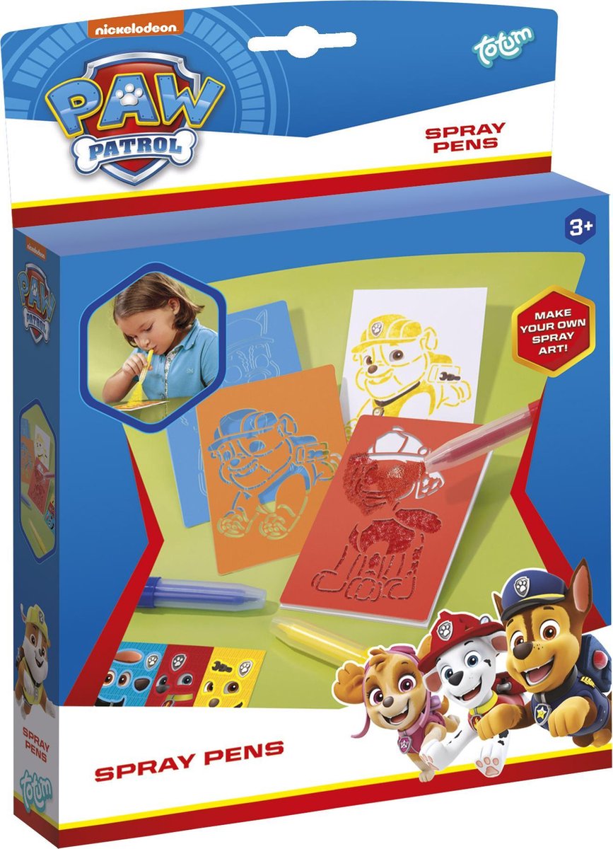 Maak je eigen Paw Patrol schilderijtjes met deze spray pen set van Totum. Inhoud: - 3 Paw Patrol sjablonen - tekenblok - 3 blaaspennen - Paw Patrol stickervel - gebruiksaanwijzing