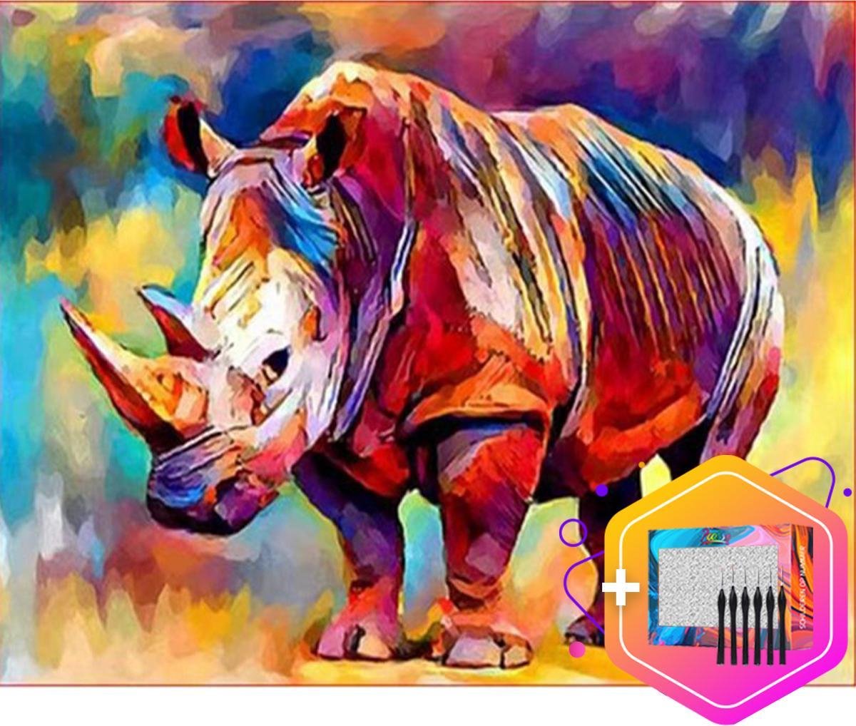 Pcasso ® Neushoorn Multicolor – Schilderen Op Nummer – Incl. 6 Ergonomische Penselen En Geschenkverpakking - Schilderen Op Nummer Dieren - Schilderen Op Nummer Volwassenen – Canvas Schilderdoek – Kleuren Op Nummer - Paint By Number - 40x50 cm
