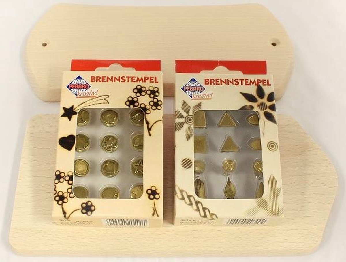 Deze brandstempel navulset is geschikt voor de houtbranders van het merk Pebaro. Als uitbreiding op de standaard opzetztukjes bij de houtbrander, kan je nu ook namen of leeftijden ergens gemakkelijk in branden. Wanneer je voor de vormen kiest worden de mogelijkheden van versieren eindeloos. Verkrijgbaar in 2 uitvoeringen: Letters en Cijfers, 12 brandstempels Vormen, 8 brandstempels Super leuk om voorwerpen persoonlijk te maken voor bijvoorbeeld cadeautjes. De stempels zijn geschikt om te gebruiken op kurk, leer en uiteraard hout. De diameter van de stempels varieren rond de 10 mm. In beide sets zitten 2 houten plankjes om direct te beginnen. Een leuke aanvulling voor de houtbrander basis of deluxe!
