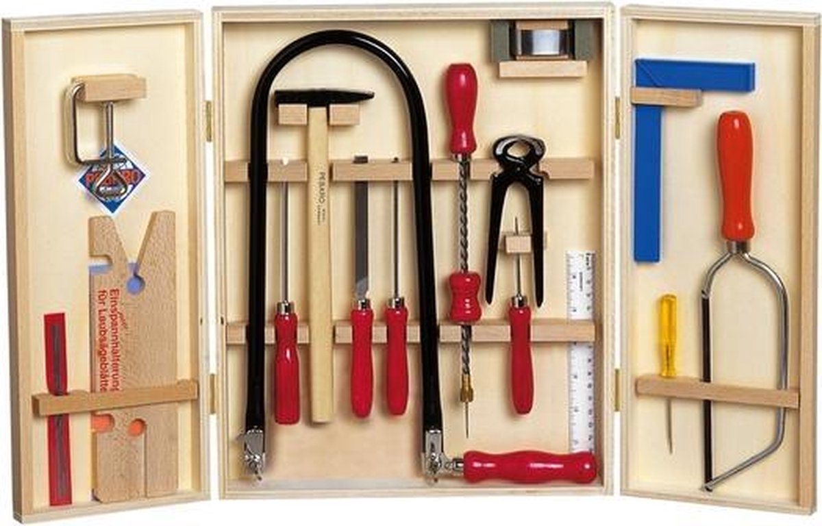 Mooi figuurzaagset van Pebaro met houten plankjes en hoge kwaliteit stalen gereedschap. Deze set wordt geleverd met een houten kast met dubbele deuren. Al het gereedschap heeft zijn eigen plaats in de kast, zo houdt u het mooi overzichtelijk. Zeer complete set met veel gereedschap zoals vijlen, schroevendraaiers, figuurzaag enz.