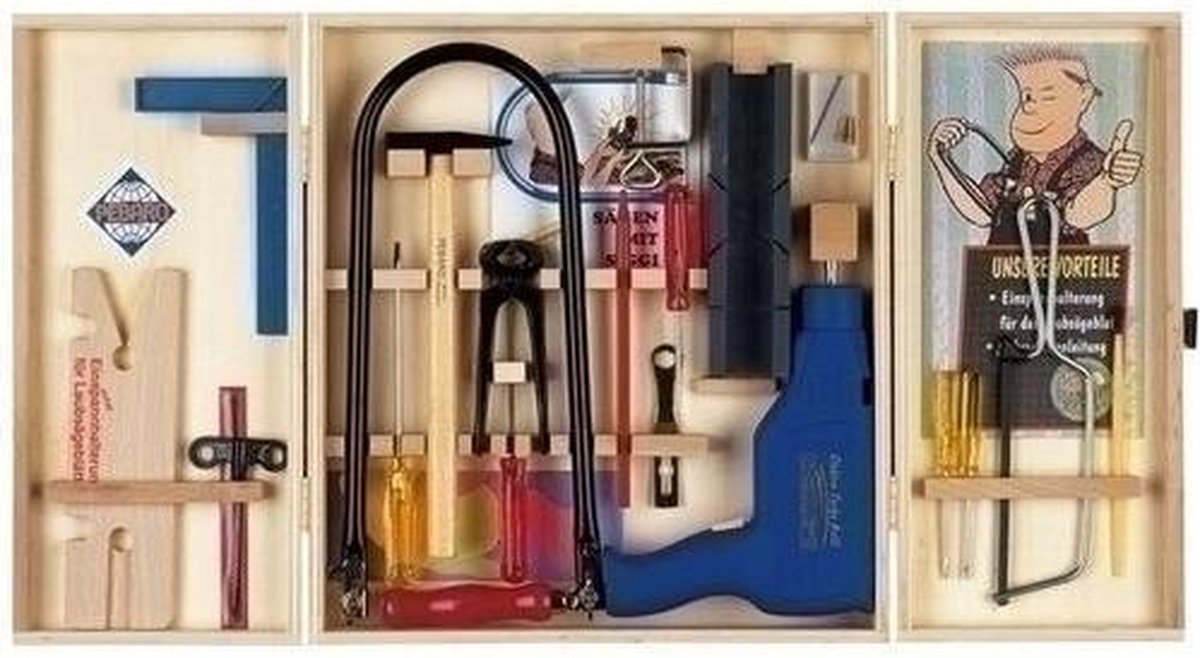 Uitgebreide houtbewerkingsset van Pebaro, houten- stalen gereeschap en een boormachine (batterijen niet meegeleverd). Alles in een handige houten ophangkast zodat al het gereedschap netjes kan worden opgeruimd. Deze uitgebreide set is een prachtig cadea om te geven met de feestdagen!