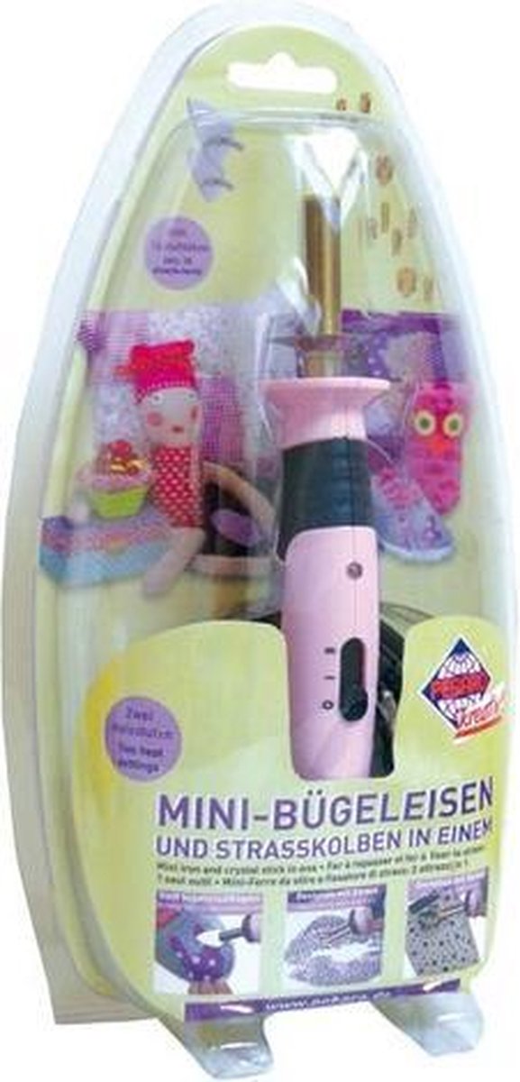 Deze strasspen wordt geleverd met verschillende opzetstukken en een afleghouder alsmede een strijkijzertje. Het strijkijzertje is ideaal voor het opstrijken van strijkpatronen, exclusief strasstenen