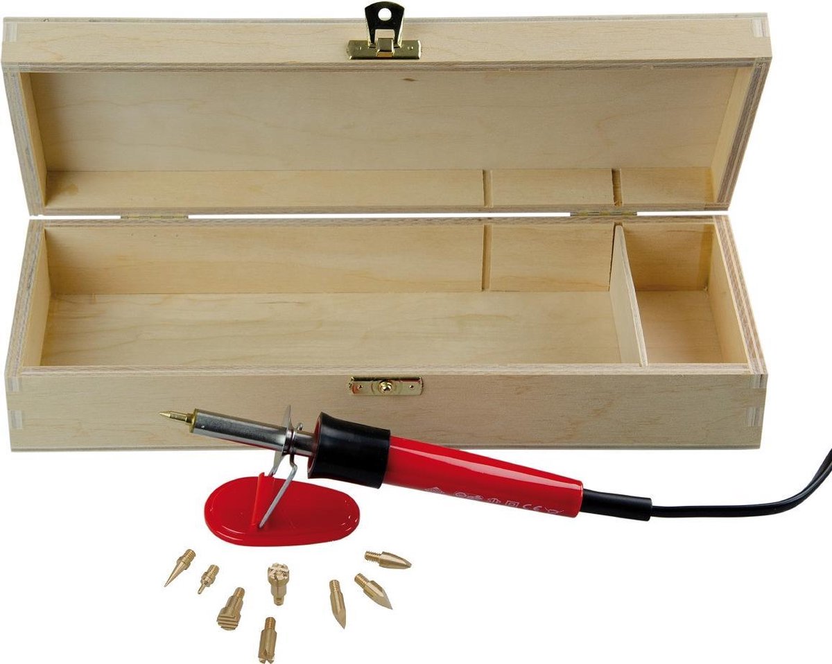 Houtbrander basis set met 9 opzetstukken in een houten opbergkistje. De houtbrander is geschikt om te schrijven, tekenen en branden op materialen zoals hout, kurk en leer. Met de houtbrandpen en verschillende opzetstukken kan je alles maken wat je wilt op verschillende materialen. Begin direct met het versieren van het houten opbergkistje! Inhoud houtbrandpen 6 brandpunten 3 brandstempels steuntje houten opbergkistje De houtbrander (30 watt) wordt ongeveer 500 graden. Geschikt voor kinderen vanaf 14 jaar en voor kinderen onder de 14 jaar met toezicht van een volwassene.