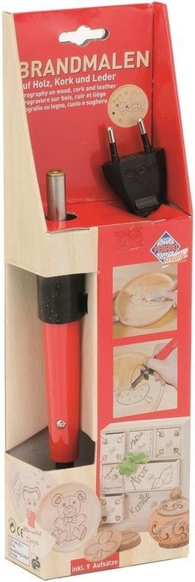 Houtbrander basis set met 9 opzetstukken voor het schrijven, tekenen en branden van materialen zoals hout, kurk en leer. Met de houtbrandpen en verschillende opzetstukken kan je alles maken wat je wilt op verschillende materialen. Inhoud houtbrandpen 6 brandpunten 3 brandstempels steuntje De houtbrander (30 watt) wordt ongeveer 500 graden. Geschikt voor kinderen vanaf 14 jaar en voor kinderen onder de 14 jaar met toezicht van een volwassene.