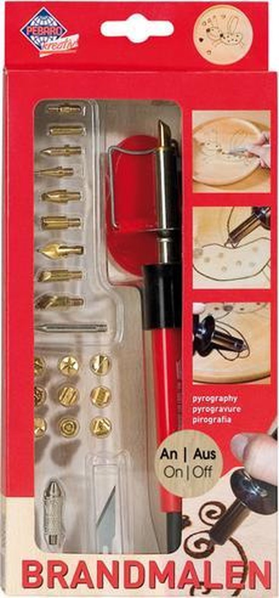 Pyrografie set met 8 punten, 10 stempels, soldeerpunt, styropormes en handleiding. Met handige aan -en uit knop