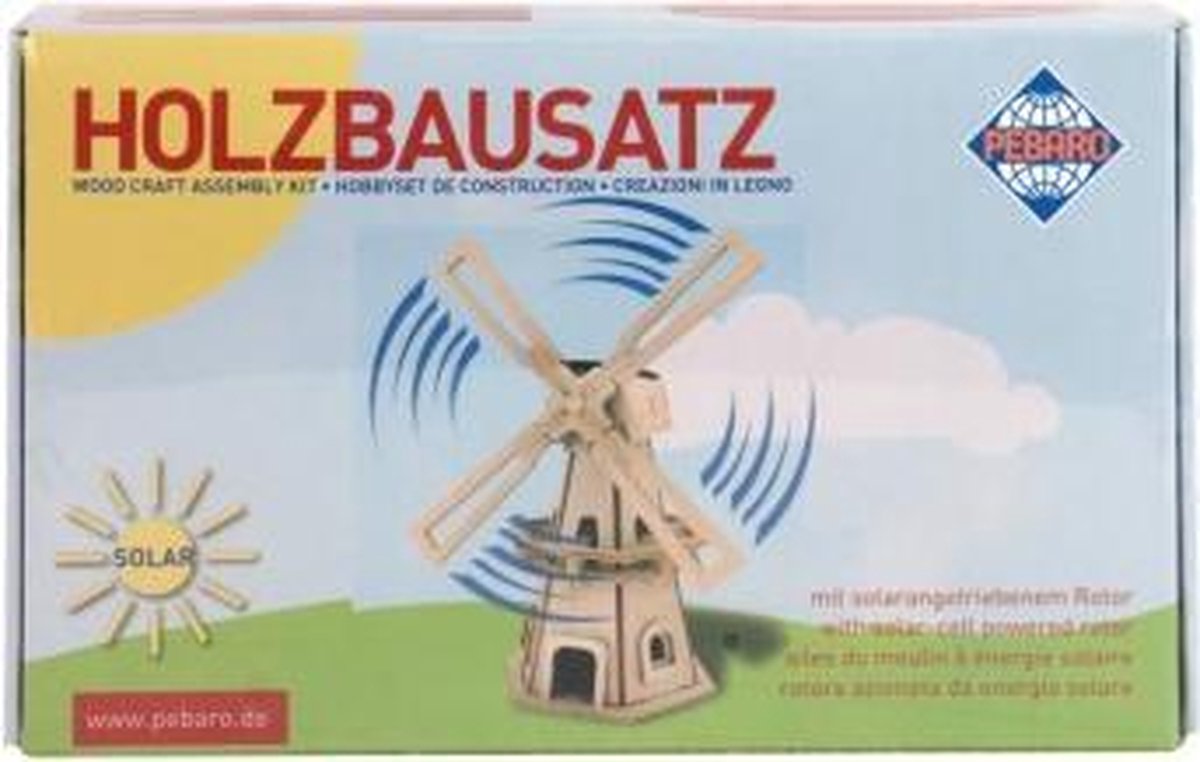 De wieken van de Pebaro windmolen kunnen draaien doormiddel van zonne energie. Breek de verschillende onderdelen uit de houten platen en construeer de windmolen. Verf daarna de molen zoals je zelf wilt. Let op: Onderdelen kunne voor de stevigheid van het geheel gelijmd worden met houtlijm. Ook kunnen sommige onderdelen beter passen door er licht met (het bijgeleverde) schuurpapier langs te gaan