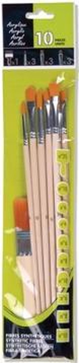 Synthetische vezels. Set van 10 acrylverpenselen. Inhoud: 1 kwast nr 25, 3 ronde penselen, 3 platte penselen en 3 kattentongpenselen.