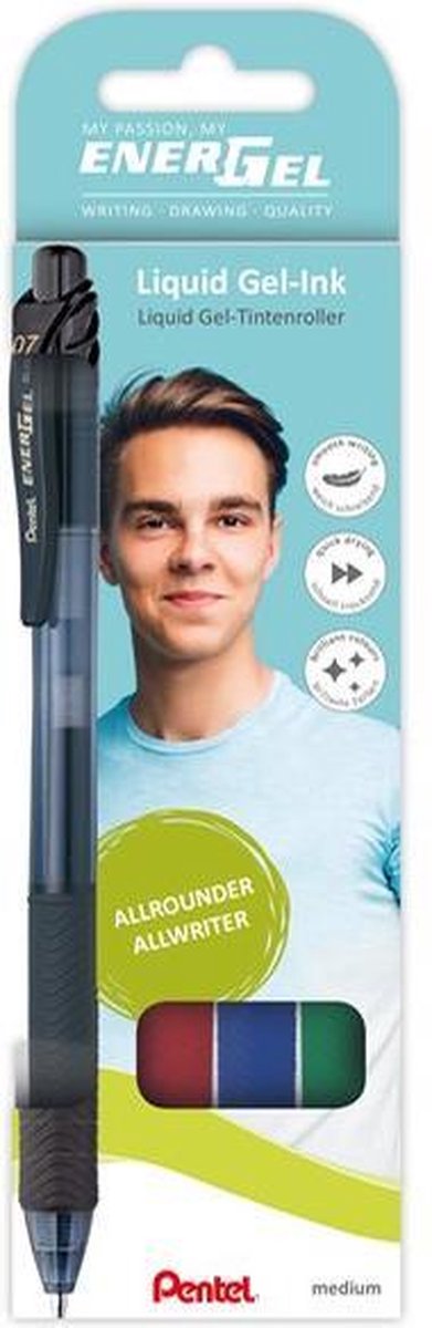 •Pentel EnerGel BL107 met drukknopmechanisme schrijft verrassend soepel, droogt bijzonder snel en vlekt niet •Het is de ideale samensmelting van gel en vloeibare inkt die zorgt voor een ongeëvenaard schrijfgenot •De pen bestaat voor 87% uit gerecycled materiaal en is navulbaar met de LR7 vulling •Schrijfbreedte: 0,4mm •Assorti van 4 kleuren: zwart, rood, blauw, groen