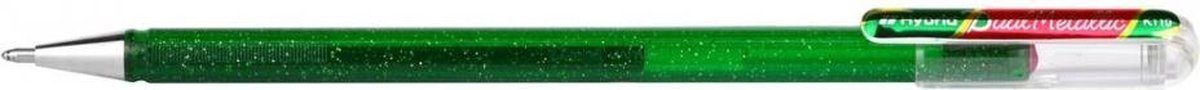 Uniek: Een glitter gel pen met twee kleuren!??De speciale inkt in de Hybrid Dual Metallic pennen verandert van licht naar donker bij een verandering van de lichtinval. De inkt geeft een 'shimmering' glans en glitter effect. Innovatieve gelroller die 2 verschillende kleuren laat zien afhankelijk van de lichtval en de kijkhoek. De kleuren veranderen op licht/donker papier. Ideaal voor het markeren en ontwerpen op donker papier. Het glanzende glitter effect blijft zichtbaar op donker papier. Lijndikte 0,5 mm. De kleurencombinatie is groen/metallic rood.