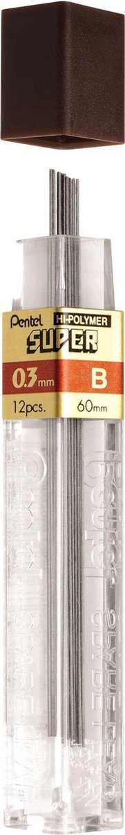Super hi-polymer stiften 0,3 mm. Hardheid: H. Materiaal is een mengsel van kunsthars,grafiet en carbon. Zeer dichte structuur zorgt voor een diepzwarte lijn en exacte lijndikte. Soepel en breukvast. Lengte 60mm. Koker 12 stuks